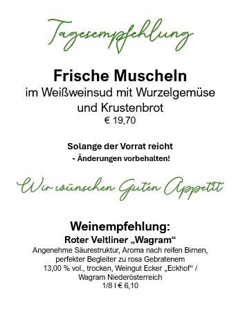Tradition trifft hier auf Genuss und Gemütlichkeit – das spiegelt sich in den urigen Räumlichkeiten ebenso wider wie in der sorgsam ausgewählten Speisekarte und den täglich wechselnden Empfehlungen. Wirtshausküche, kombiniert mit feinen alpenländische Speisen, unverwechselbaren regionalen Schmankerln, ergänzt um internationale Gerichte wie Muscheln, Fisch und vieles mehr…